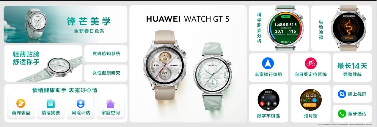 华为WATCH GT 5系列带来46mm苍山灰、41mm湖光青两款全新时尚配色,演绎春日腕间新境。华为WATCH GT 5系列首发了情绪健康助手,新色情绪健康助手功能再升级,情绪健康摘要可以智能分析用户的周/月/年度的情绪健康状况;情绪在一段时间内出现波动时,华为运动健康APP会提醒用户进行情绪健康风险测评,帮助用户及时发现情绪风险。除此之外,还新增了小狗逗逗和小猫绵绵两种情绪表盘。目前,华为WATCH GT 5系列两款新配色已经开启全网预售,新色优惠150元,折后享国补政策再减15%,到手最低1138元。
